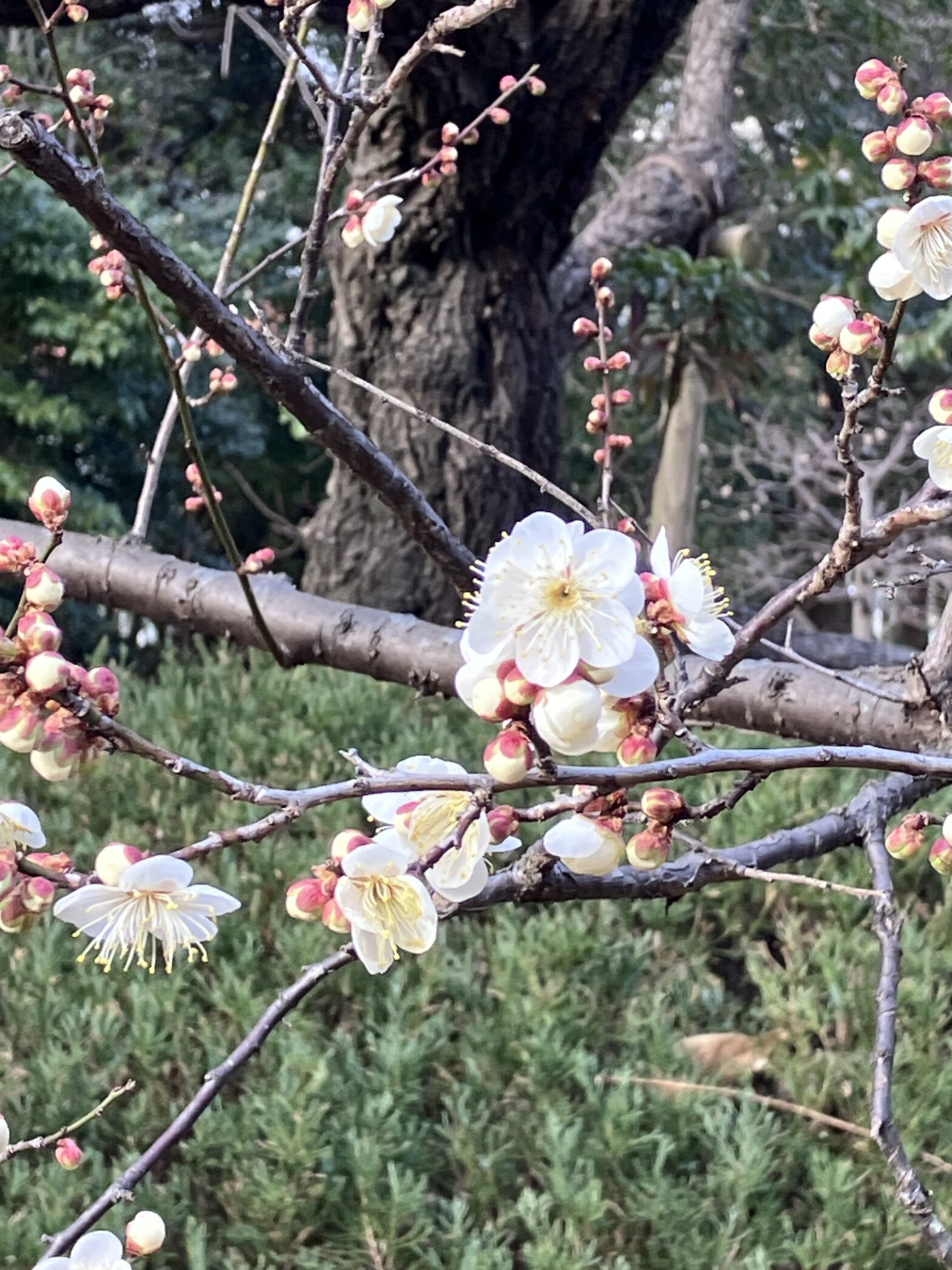 観音寺には数種類の梅の木があります。日当たりの良い枝では花が咲き始め良い香りを漂わせています。