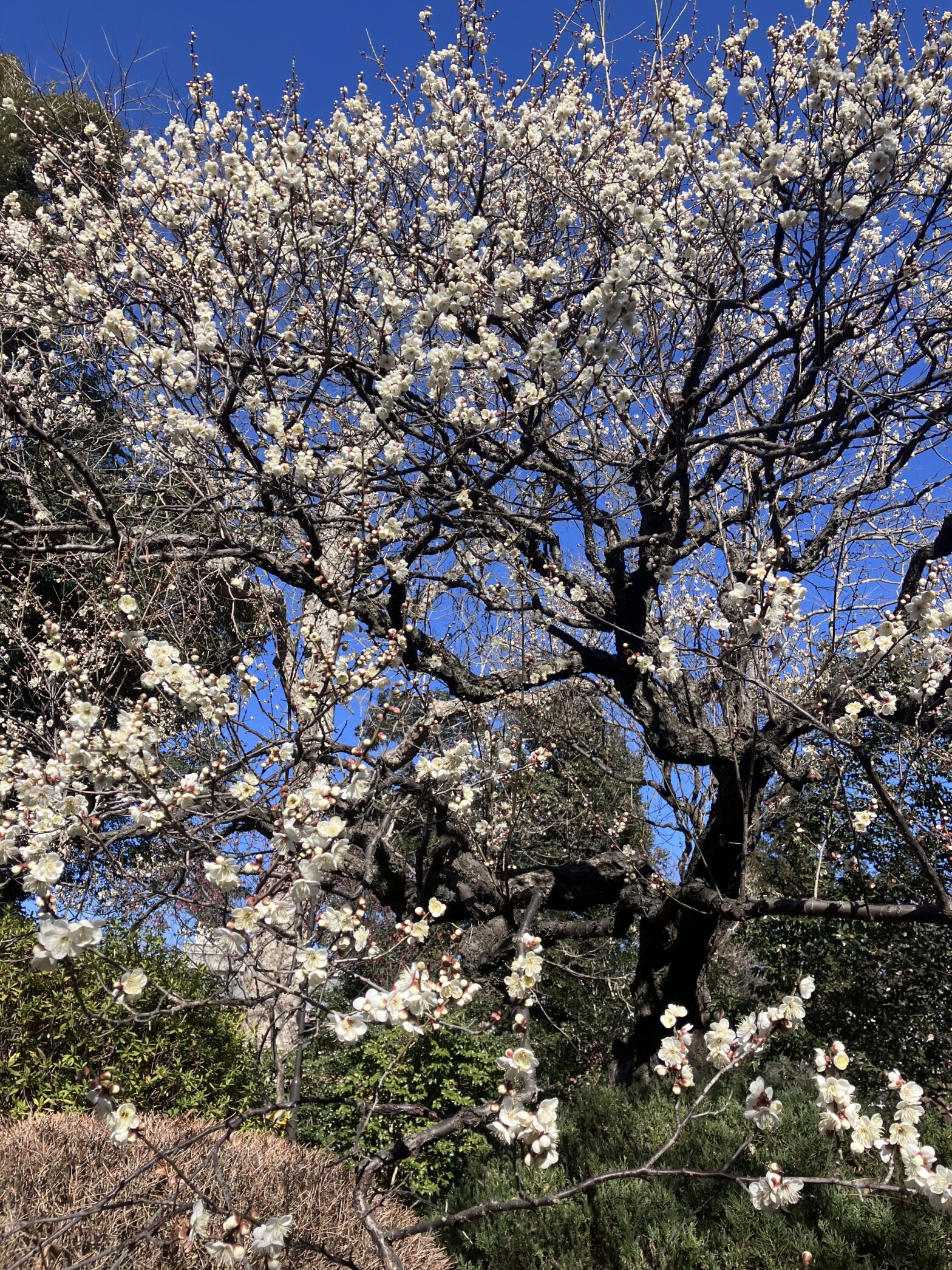 青空に真っ白な梅の花がとても映えています。