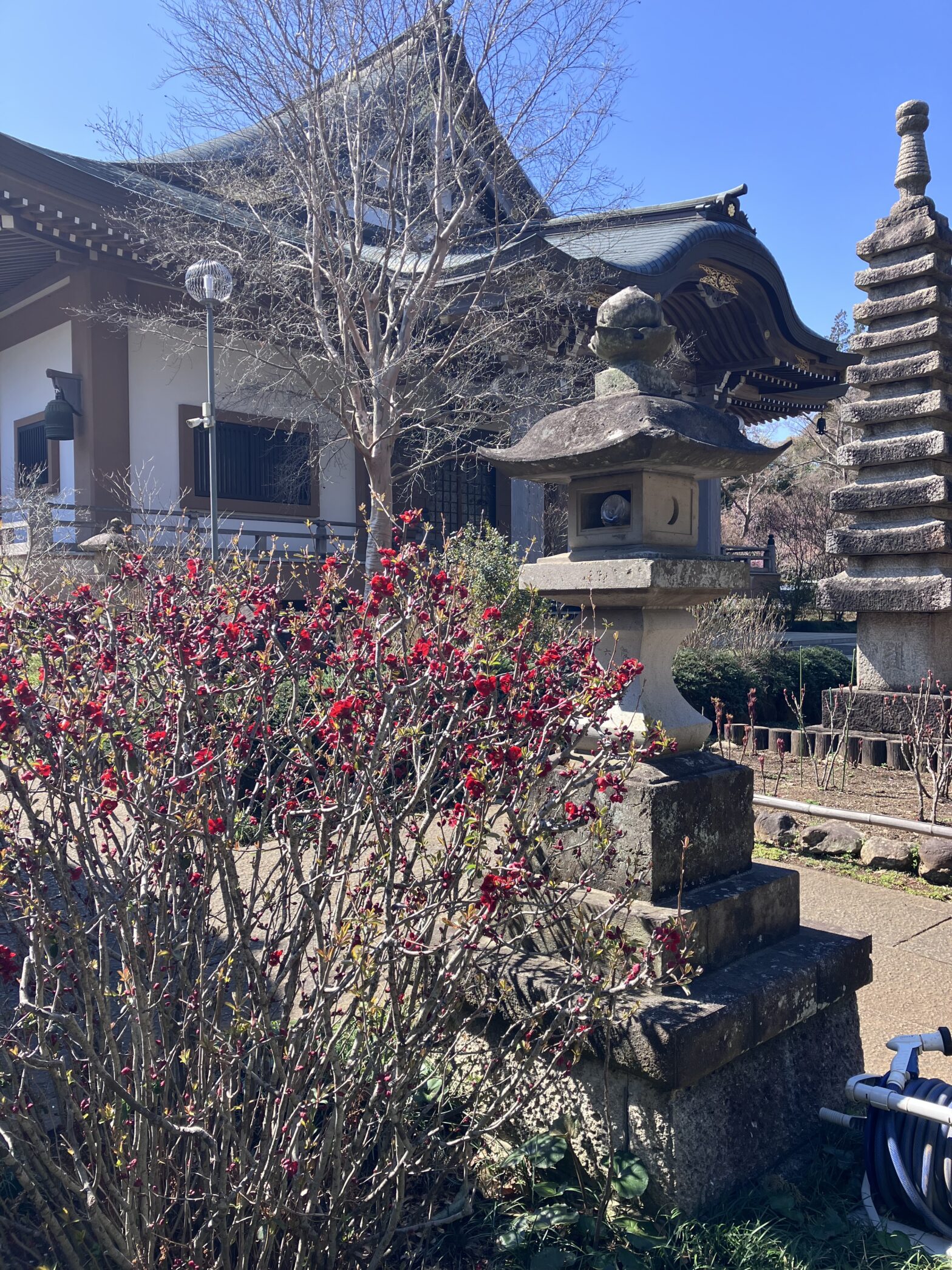様々な色のあるボケの花ですが濃い紅色は景色の中でとても映えます。