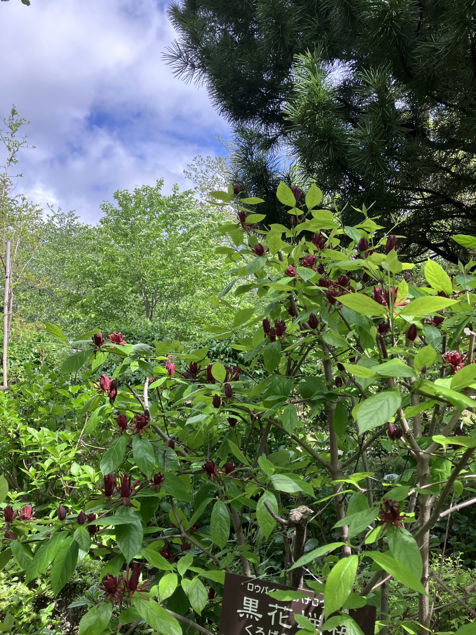 雨上がりの緑に黒花蝋梅の色がよく映えています。